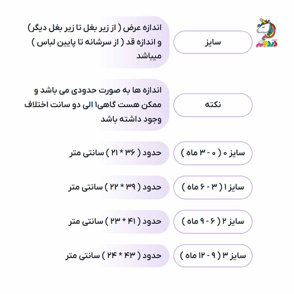سایز ۰ ( ۰ – ۳ ماه ) ,سایز ۱ ( ۳ – ۶ ماه ) ,سایز ۲ ( ۶ – ۹ ماه ) ,سایز ۳ ( ۹ – ۱۲ ماه ) |