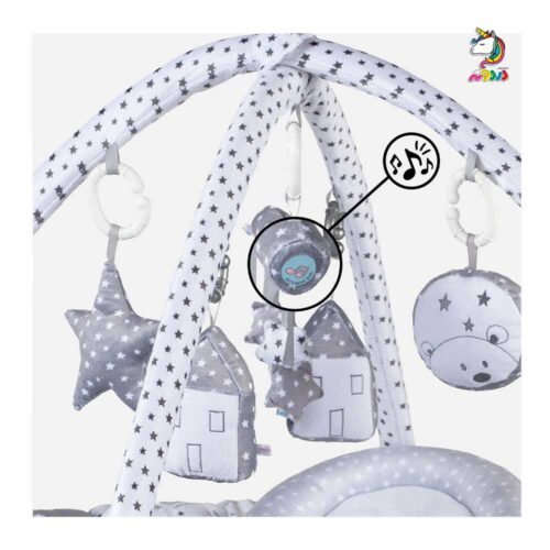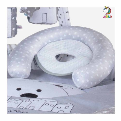 دو عروسک آویز، دو عروسک جغجغه دار، یک مکعب صدا دار و استوانه موزیکال کنجکاوی کودک، دارای پشه بند، بالش c شکل ضد تعریق |