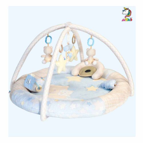 دو عروسک آویز، دو عروسک جغجغه دار، یک مکعب صدا دار و استوانه موزیکال کنجکاوی کودک، دارای پشه بند، بالش c شکل ضد تعریق