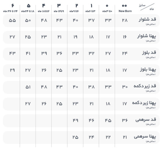 | ماه / سایز | 00 | 0 | 1 | 2 | 3 | 4 | 5 | 6 |