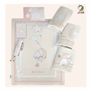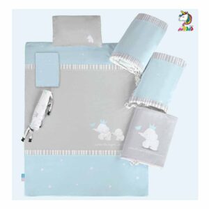 لحاف(140*100) – بالش (45*35) – روبالشی اضافه (45*35) – ملحفه (145*120) – دورتختی کناره ها(2عدد 130*45) – دورتختی تاج تخت (75*45) -عروسک موزیکال (20*17) |